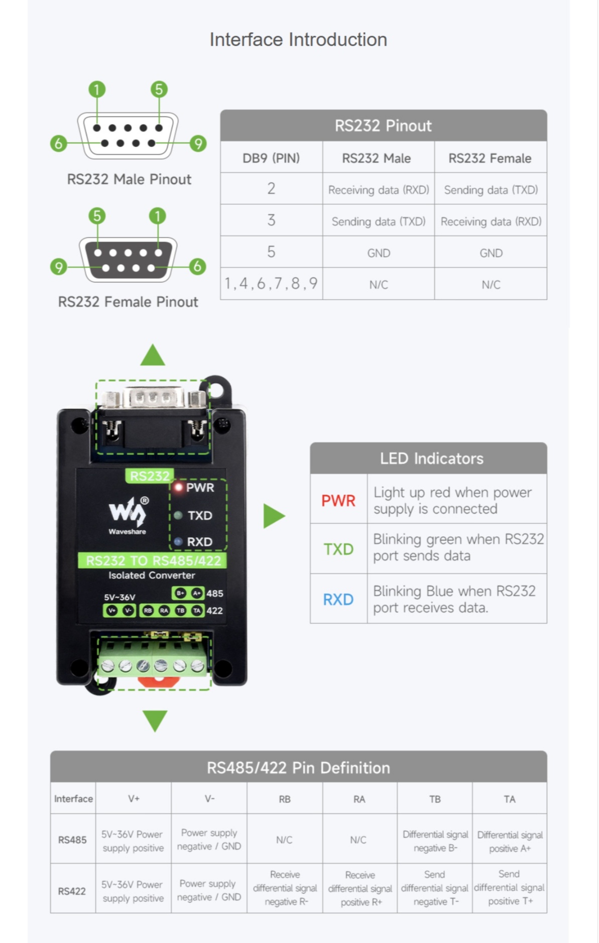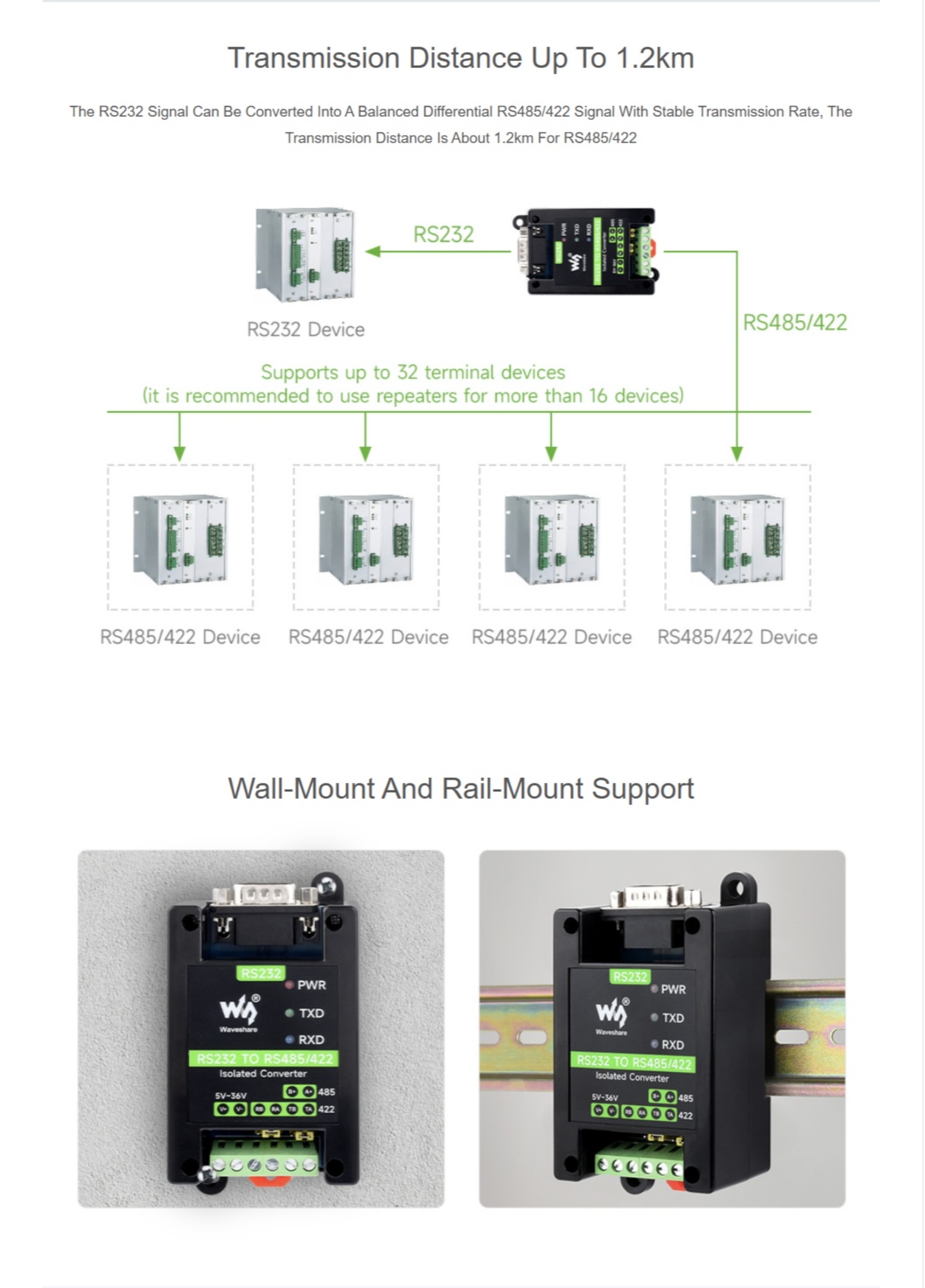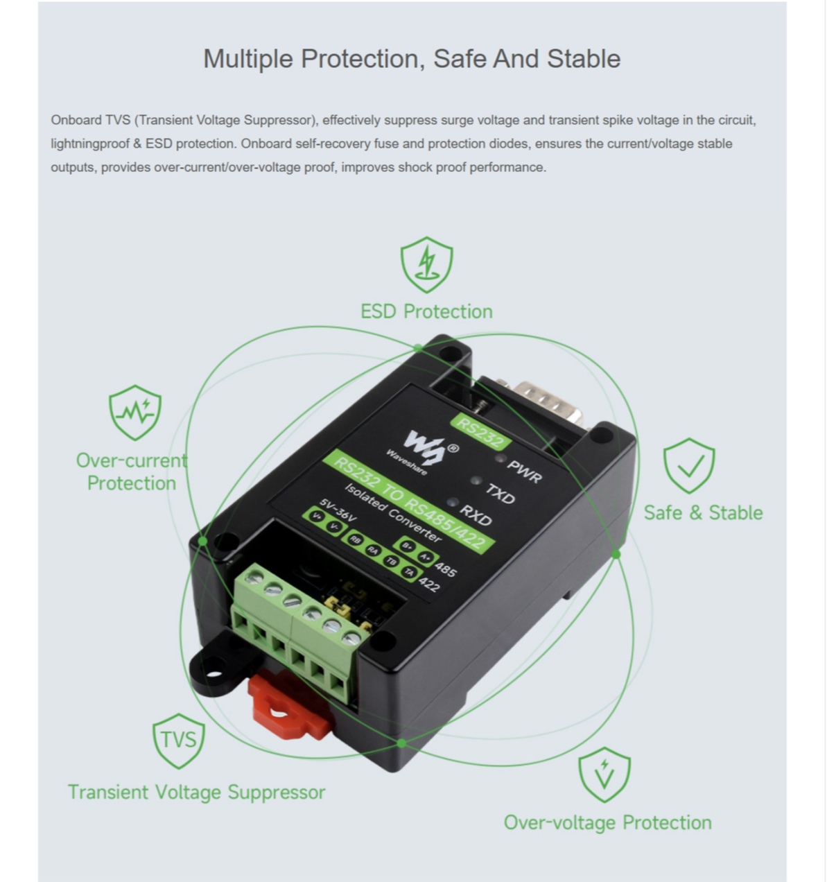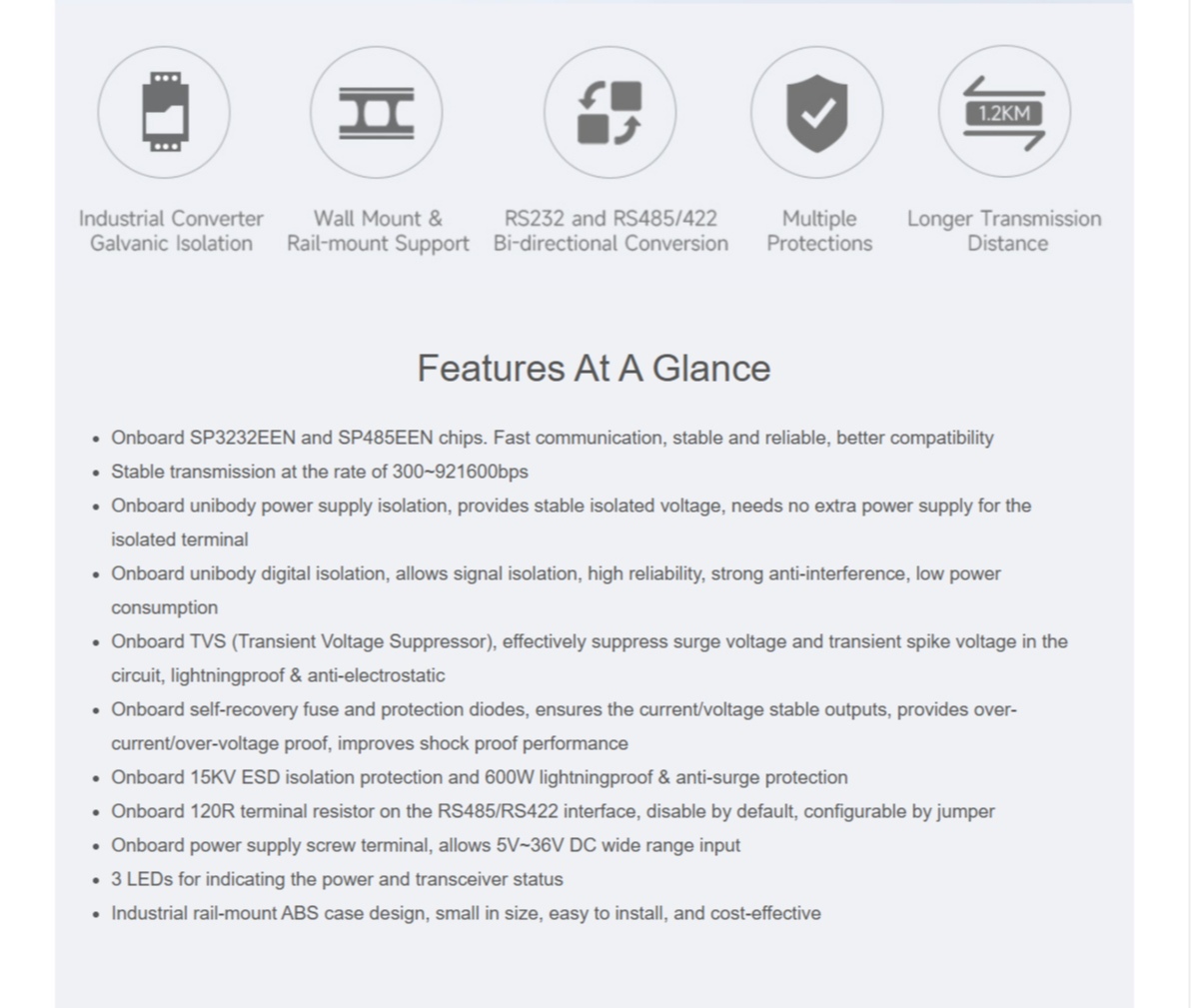 - 採用 SP3232EEN 和 SP485EN 晶片方案,通訊穩定,內建電氣隔離、防雷防靜電等多種工業防護,適用於各種通訊需求高的工控設備或應用