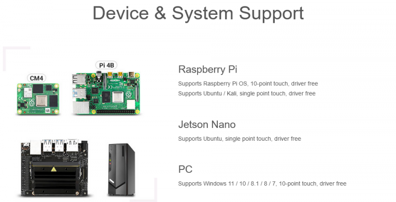 - 連接樹莓派時,支援 Raspberry Pi OS,10 點觸控,Ubuntu / Kali / Retropie 等作業系統單點觸控,免安裝驅動程式